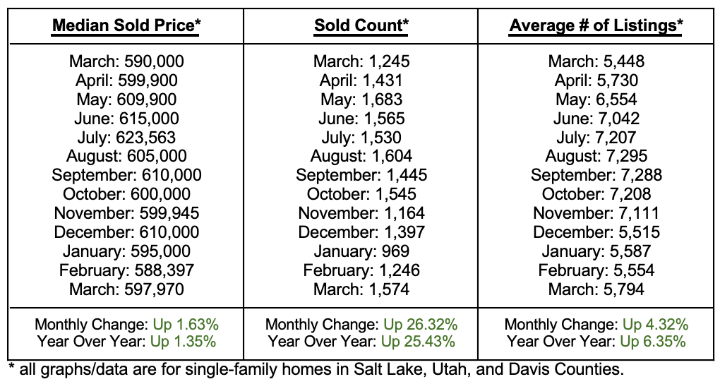 Utah’s housing market gained momentum in March, signaling the start of a more active spring season. The median sold price rose to $597,970, up 1.63% from February and 1.35% year over year, showing continued price stability with slight upward movement. Sales activity saw a significant increase up 26.32% month-over-month, indicating renewed buyer demand. Inventory also increased 4.32% from February, giving buyers more options. Overall, March reflects a healthy and accelerating market, with rising sales and stable pricing, but a growing inventory could keep prices from climbing much higher.