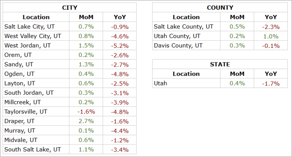 Utah’s rental market continued to show gradual stabilization in March, with statewide rents increasing 0.4% month over month while remaining 1.7% below last year’s levels. At the county level, Salt Lake County posted a modest monthly gain but continues to trend downward year over year, Utah County remains the strongest performer with positive annual growth, and Davis County saw slight monthly improvement with minimal annual decline. City-level trends were mixed but generally steady, with most areas experiencing small month-over-month increases led by Draper, West Jordan, and Sandy while a few locations such as Taylorsville saw minor declines. Overall, March reflects a stable rental market with modest upward movement, as conditions continue to rebalance heading into the spring season.