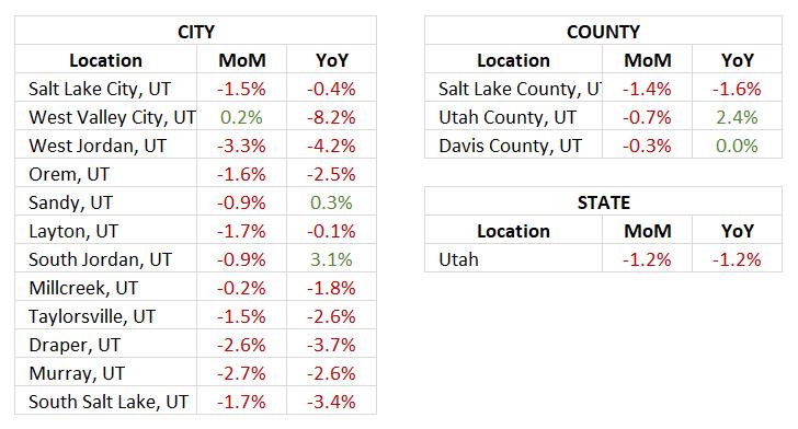 Utah’s rental market softened further in November, with most cities and counties posting modest month-over-month declines. Statewide rents dipped 1.2%, matching the 1.2% annual decline, signaling continued cooling as the market adjusts to shifting demand. At the county level, Salt Lake County saw a 1.4% MoM drop, while Utah County experienced a smaller 0.7% decline but remained up 2.4% year over year, making it the strongest-performing county annually. Most cities recorded slight monthly decreases, with West Jordan, Draper, and Murray seeing the largest pullbacks. However, a few pockets showed resilience: West Valley City posted a minor 0.2% monthly increase, and South Jordan led year-over-year gains at 3.1%, signaling localized strength despite broader statewide softness. Overall, November reflects a market that continues to cool gradually, with mixed performance across cities but stable long-term demand in select areas.