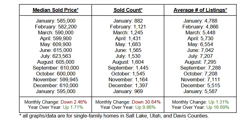 As the new year begins, Utah’s housing market is settling into its typical winter rhythm. The median sold price dipped to $595,000, down slightly from December, but it’s still higher than this time last year, showing that home values remain steady overall. Sales slowed to 969 closings, which is normal for January, yet activity is still stronger than it was a year ago, a sign that buyers are still engaged despite seasonal slowdowns. Meanwhile, inventory inched up to 5,587 active listings, giving buyers more options compared to last year. Overall, January feels less like a downturn and more like a seasonal reset, with steady pricing and improving supply laying the groundwork for a more active spring market ahead.