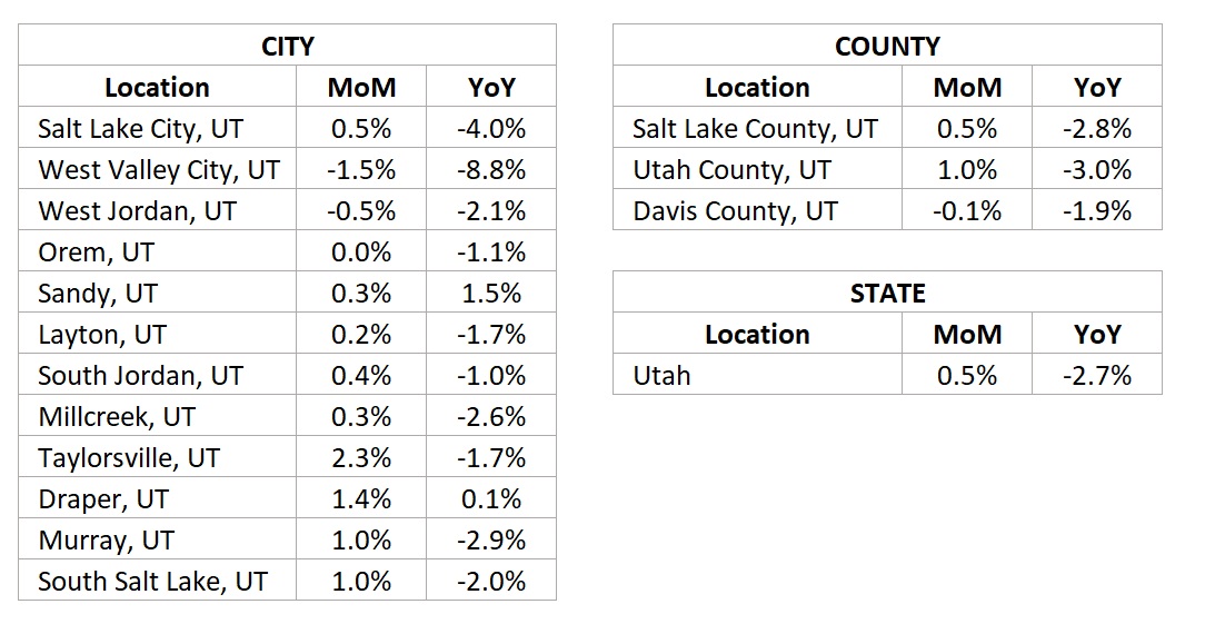 Utah’s rental market continued its path toward stabilization in April, with most cities and counties posting monthly gains, though year-over-year figures remain negative in many areas. Taylorsville, Draper, and Murray led the way in month-over-month growth, while West Valley City posted the largest decline. At the county level, Utah County saw the strongest monthly increase, while Davis County dipped slightly. Statewide, rents rose 0.5% from March, reflecting steady but cautious improvement amid ongoing affordability challenges.