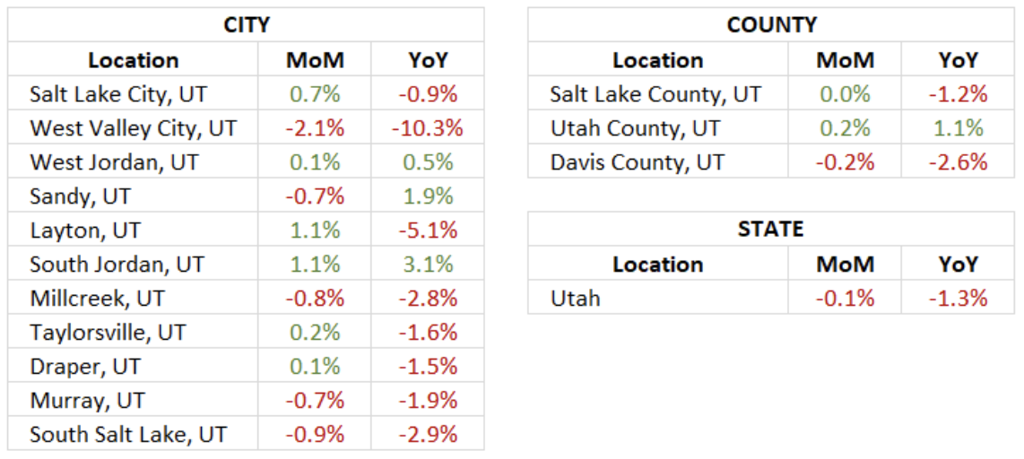 In September, Utah’s rental market remained largely stable, showing only minor fluctuations across most areas. At the state level, prices dipped slightly by 0.1% month over month and 1.3% year over year, reflecting a steady but subdued trend. County data showed mixed results. Utah County posted a modest 0.2% monthly gain, while Davis County saw a 0.2% decline. Among cities, Layton and South Jordan led with 1.1% increases, whereas West Valley City recorded the sharpest monthly drop at -2.1%. Overall, rent prices continue to hover near steady levels, suggesting a market finding balance after months of gradual adjustment.