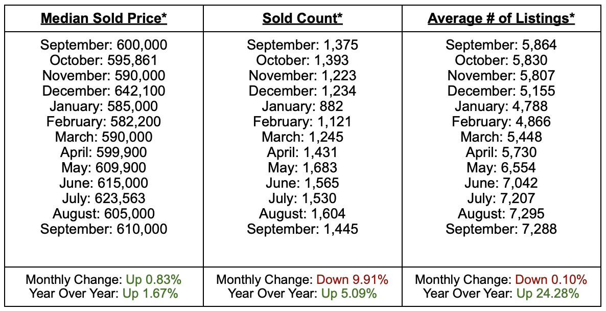 The Utah real estate market showed signs of steady balance in September, with the median sold price rising slightly to $610,000, a 0.83% increase from August and 1.67% higher than last year. Sales activity slowed following last month’s uptick, with 1,445 homes sold, reflecting a 9.91% monthly decline but still up 5.09% year over year. Inventory held nearly flat at 7,288 active listings, maintaining its highest levels of the year and remaining 24.28% above last year’s total. Overall, the market continues to show healthy movement, with prices stabilizing, inventory staying strong, and demand remaining consistent despite seasonal moderation.